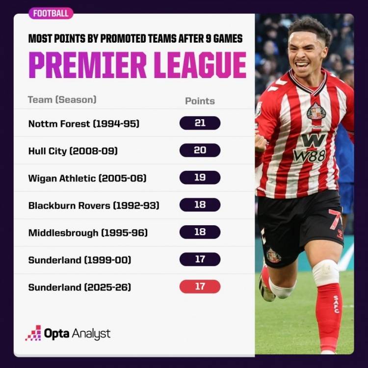 根据数据统计,桑德兰前九轮英超的战绩在英超历史升班马中位列前茅。他们以9战17分排在第六位,成绩最好的是1994-95赛季的诺丁汉森林,拿到了21分。
